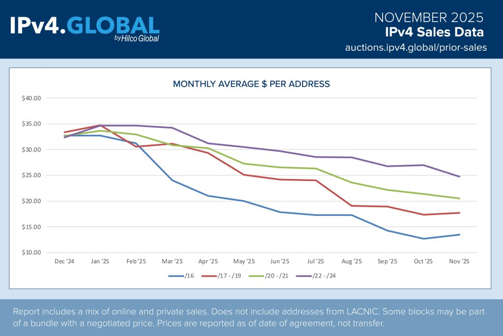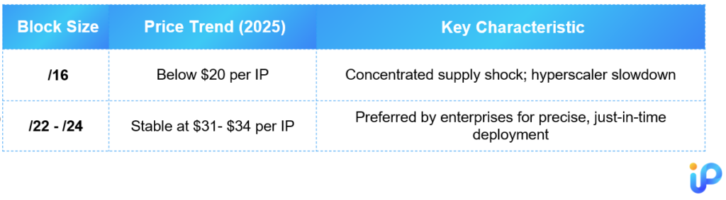 A major milestone came in November 2025: the /16 block prices finally fell below $15 per IP.