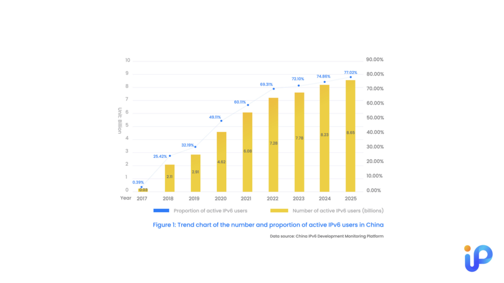 In 2025, 77% IPv6 adoption in the Asia-Pacific region has reached a milestone. China alone has 865 million active IPv6 users.