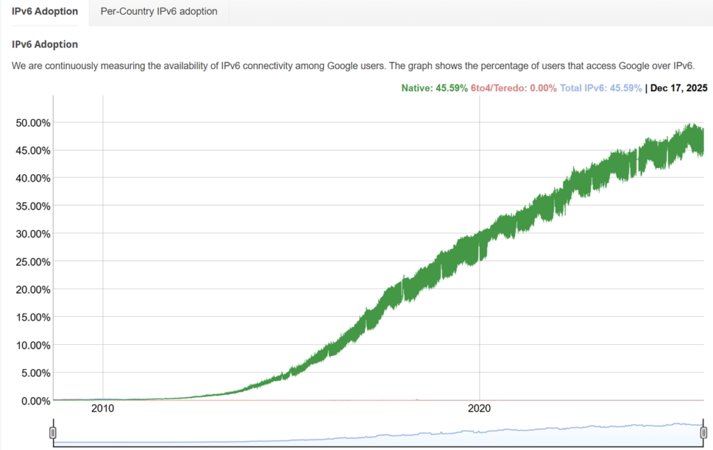 In 2025, Google IPv6 users now reached 45%. IPv6 will achieve a 60 per cent share of Google visits quite soon.