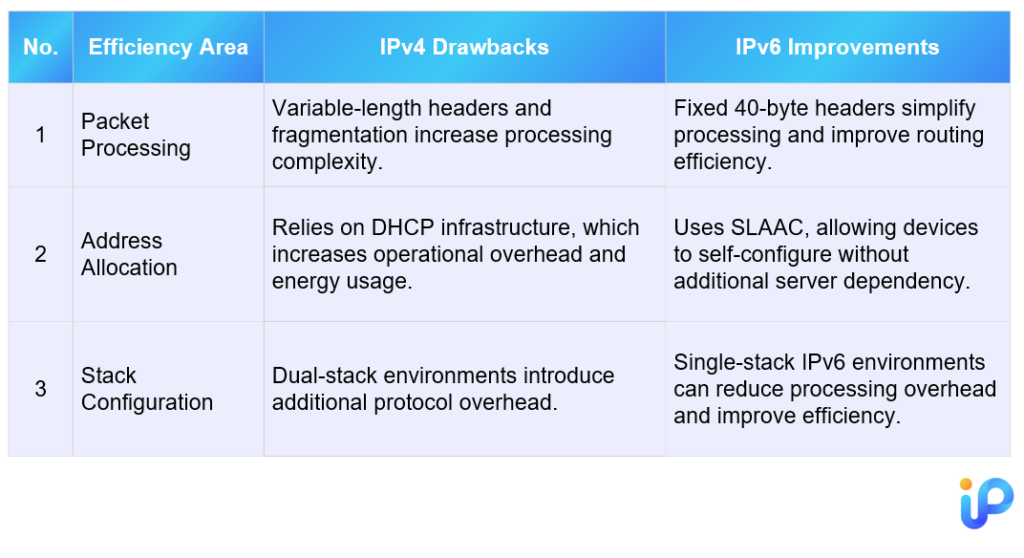 The differences between IPv4 and IPv6 are not limited to address structure. They also affect how network devices process traffic, allocate resources, and manage protocol overhead. The table below highlights several key areas where these differences influence energy efficiency in real-world network environments.