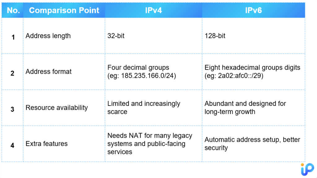 Here’s a simple table to show the main differences between IPv4 and IPv6: